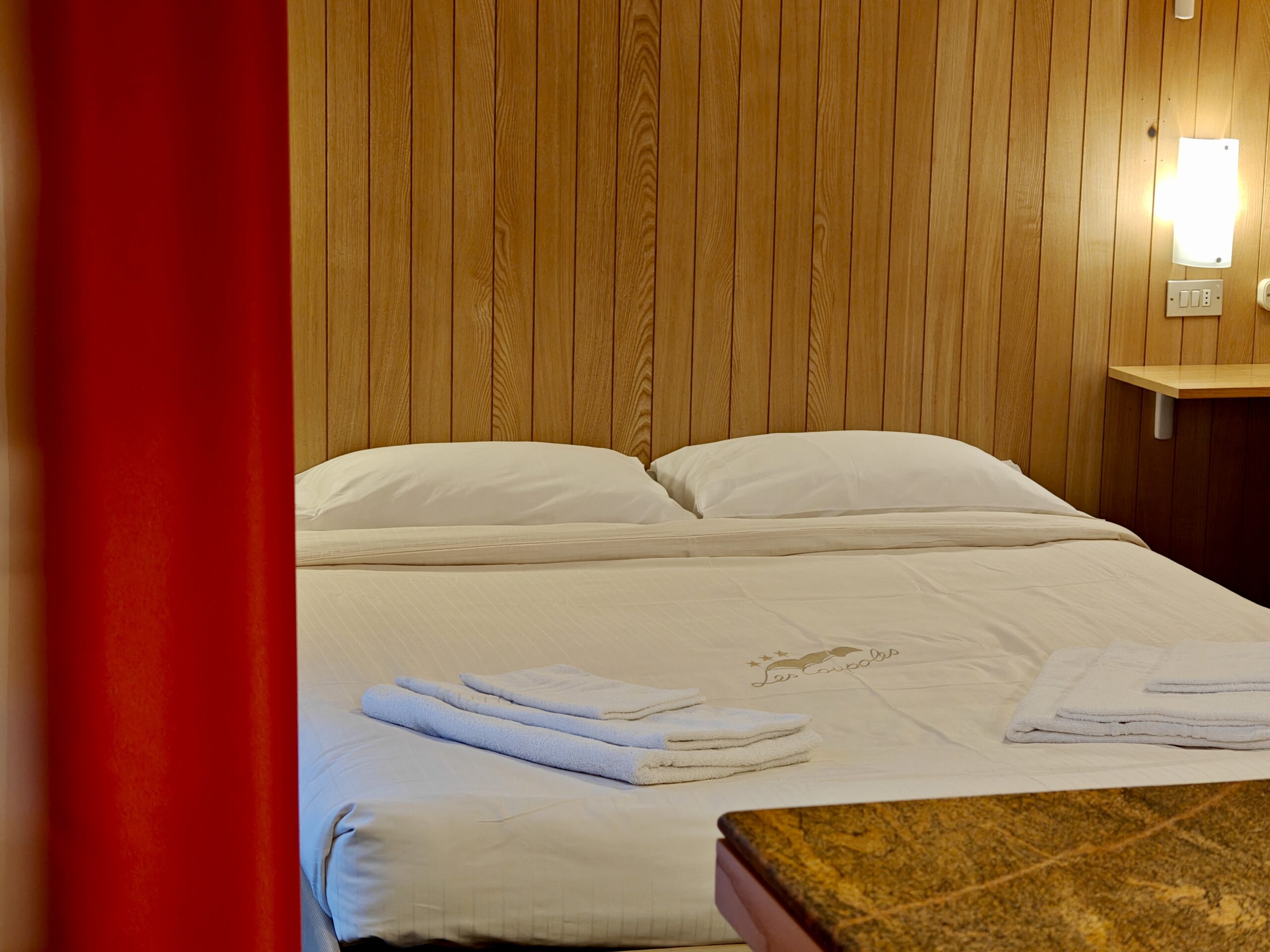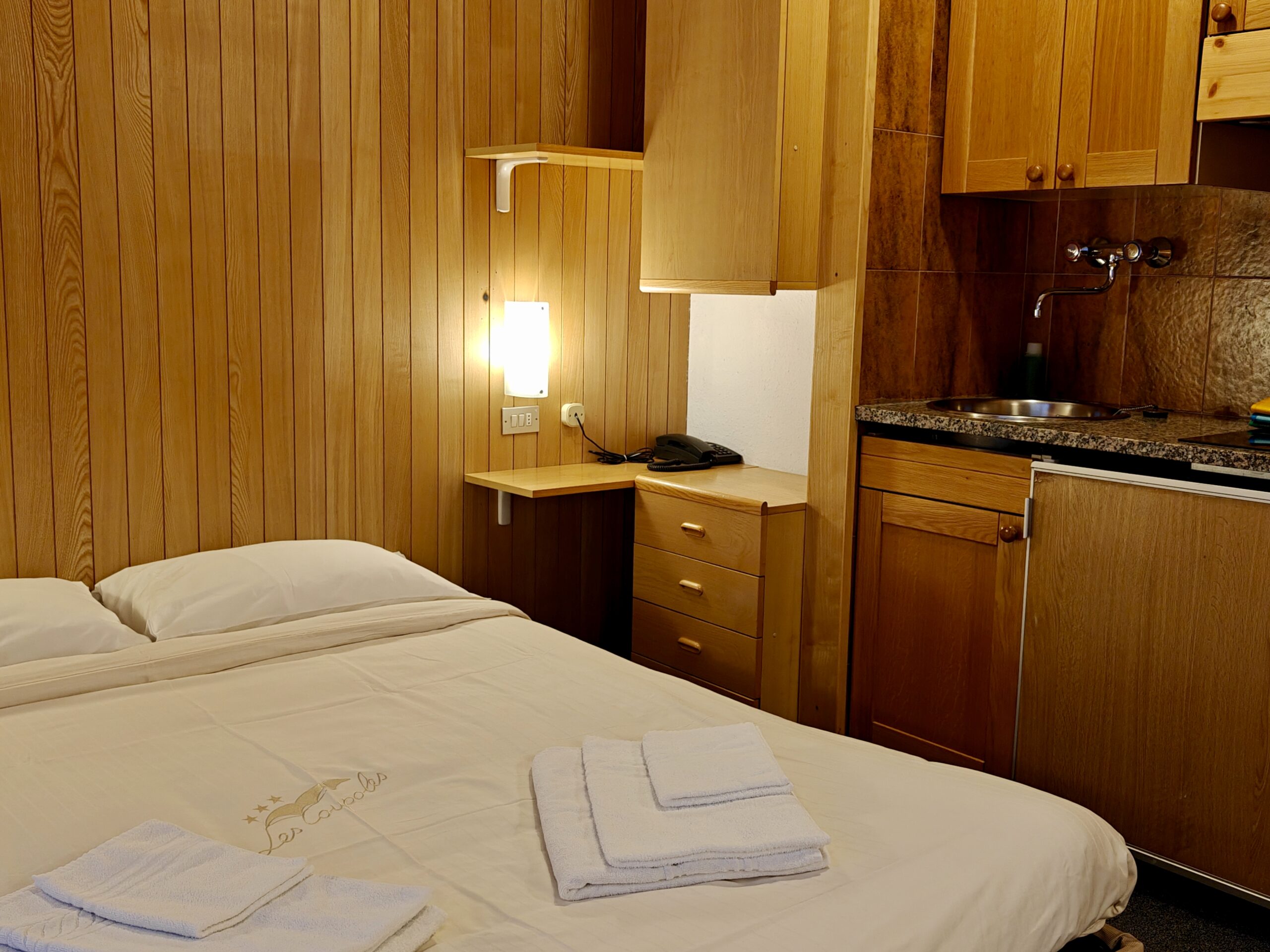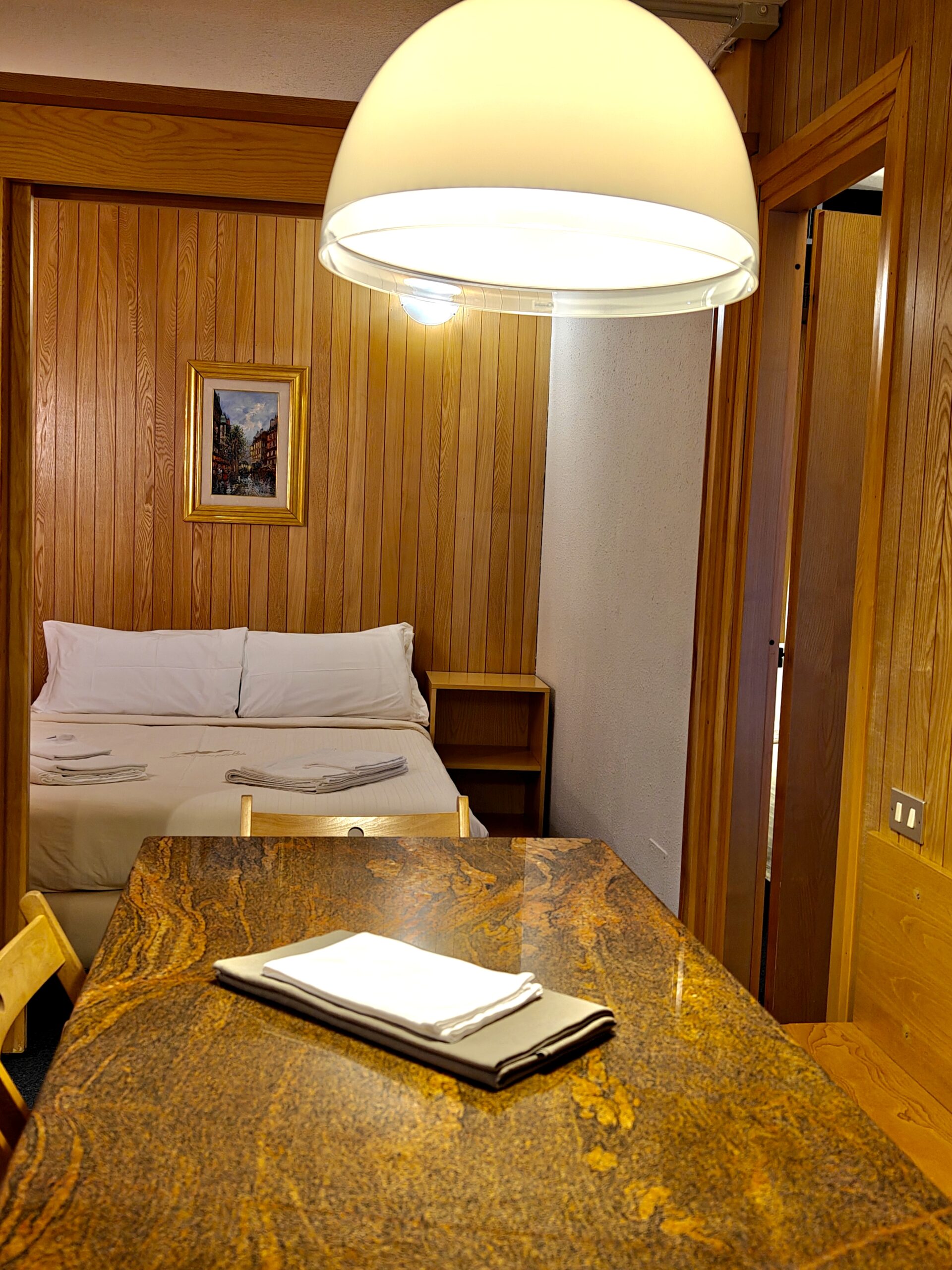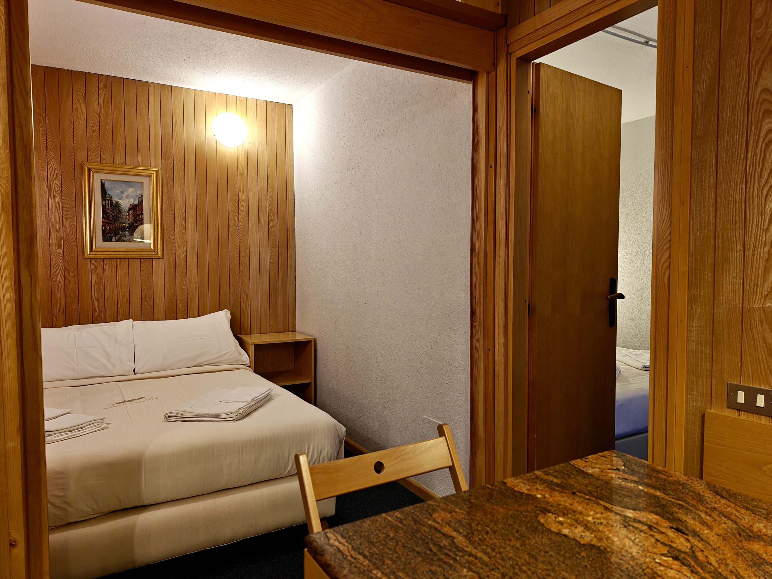 Appartamento composto da tre vani: camera ceca con letto matrimoniale, camera con un letto matrimoniale o con due singoli su richiesta, soggiorno con divano letto matrimoniale, tavolo, piccolo angolo cottura attrezzato e con induzione, bagno con doccia, balcone.